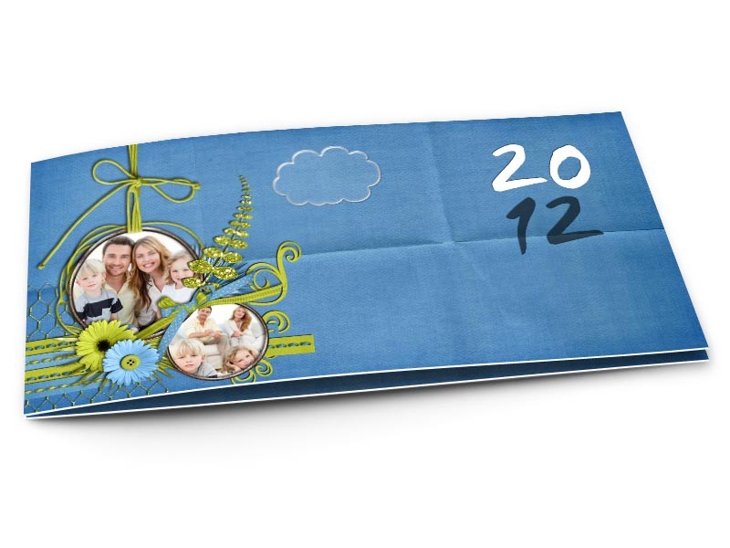 Ici c'est le bleu du ciel qui domine et se mélange à des éléments vert anis. Les deux photos sont présentées de façon originale de forme ronde représentant la bulle familiale. Des fleurs bleues et vertes ainsi qu'un nœud mêlant ces deux couleurs font parti du décor. Une carte de vœux résolument moderne.