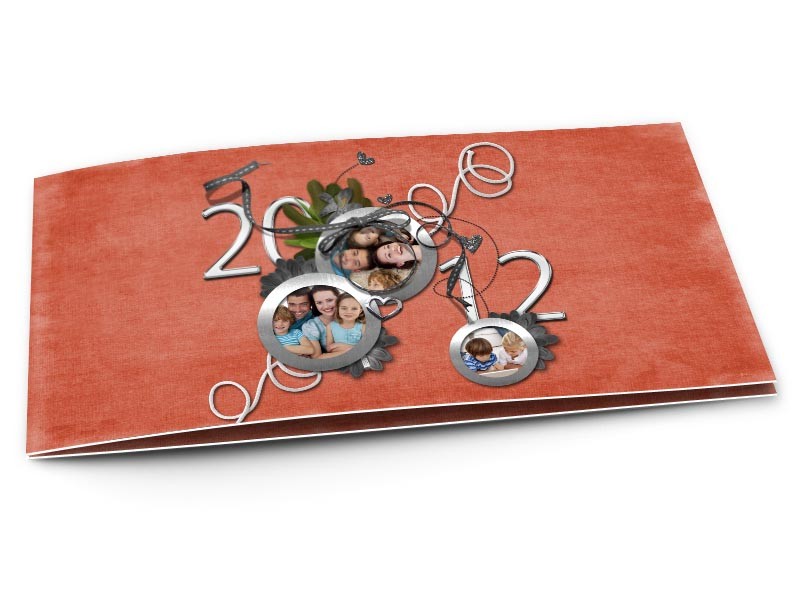 Tout en rondeurs et en chiffres cette composition originale fait penser à une grande horloge un peu loufoque. Les cadres arrondis permettent d'insérer vos photos de manière rigolote, ce qui ravira certainement vos amis ou la famille. Les cœurs pailletés et les rubans font allusion aux festivités qui se préparent. Le fond rouge clair apporte vitalité et gaité à l'ensemble.