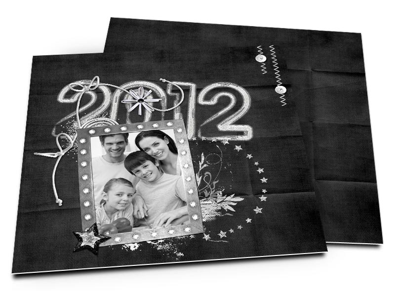 Ici tout fait référence au monde du spectacle, et peut être même au temps du cinéma noir et blanc. Le cadre photo fait penser au miroir des loges de maquillage avec toute une flopée de lumières sur celui ci, les étoiles et les paillettes au monde de la fête, et le 2012 fait penser aux néons qui ornaient jadis les façades des anciennes salles de cinéma. Une carte rigolote et bien sympathique pour annoncer vos vœux.
