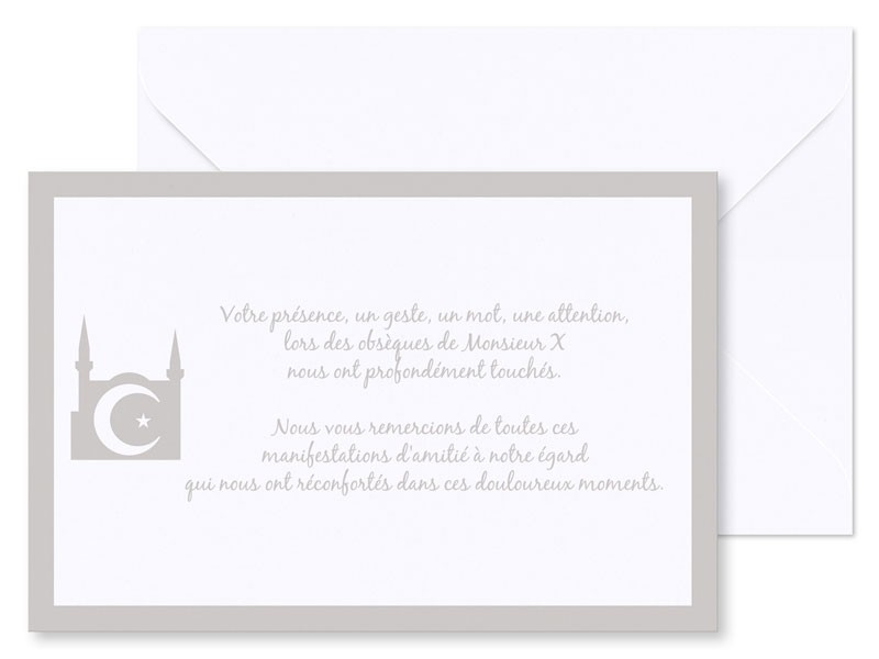 Exprimez votre reconnaissance envers vos proches et amis avec notre carte de remerciement décès musulman - Croissant de lune et étoile avec contour coloré. Cette carte de remerciement est conçue avec un design religieux qui rappelle l'importance de la religion et de la foi dans les moments difficiles. Le croissant de lune et l'étoile sont des symboles forts dans la religion musulmane et apportent une touche de spiritualité à cette carte de remerciement. Le contour coloré donne de l'éclat à la carte et ajoute une touche d'originalité. Cette carte est un moyen élégant et approprié pour remercier tous ceux qui ont été à vos côtés dans cette période difficile.