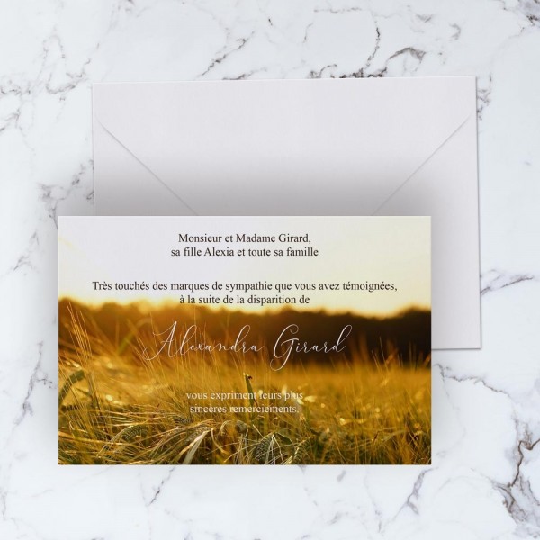 Plongez dans la beauté de la campagne avec cette carte de remerciement décès paysage mettant en valeur un magnifique champ de blé baigné par la douce lumière du coucher de soleil. Les tiges dorées se balancent gracieusement au rythme de la brise, évoquant la quiétude de la nature et la sérénité de l'au-delà. Cette carte capture l'essence de la campagne, de l'agriculture et de la cultivation, offrant un message de gratitude empreint de simplicité et de connexion avec la terre. Exprimez votre appréciation avec cette carte unique qui transmet la beauté intemporelle de la nature.