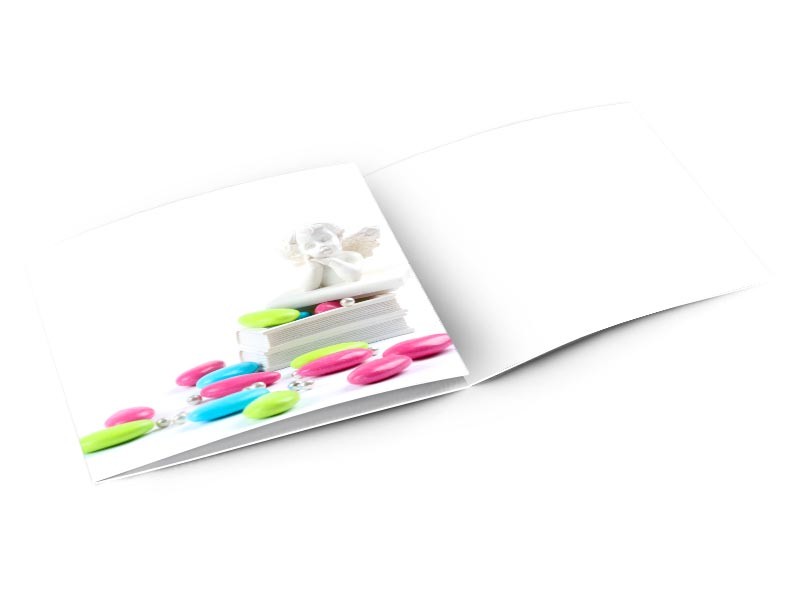 Voici un modèle coloré et traditionnel pour annoncer le baptême de votre enfant. Un ange contemple les nombreuses dragées aux couleurs éclatantes qui parsèment le design. Des perles argentées se mêlent aux dragées pour apporter une pointe de raffinement. Ce faire-part de baptême est personnalisable en ligne. Vous pouvez ajouter vos textes et vos photos.
